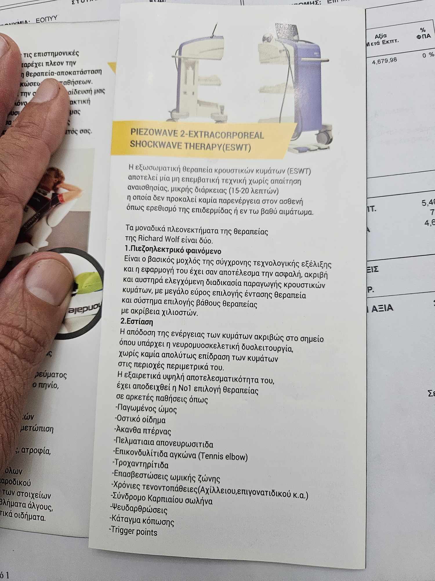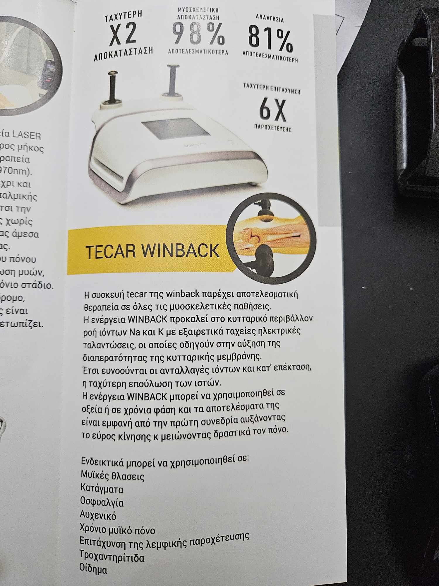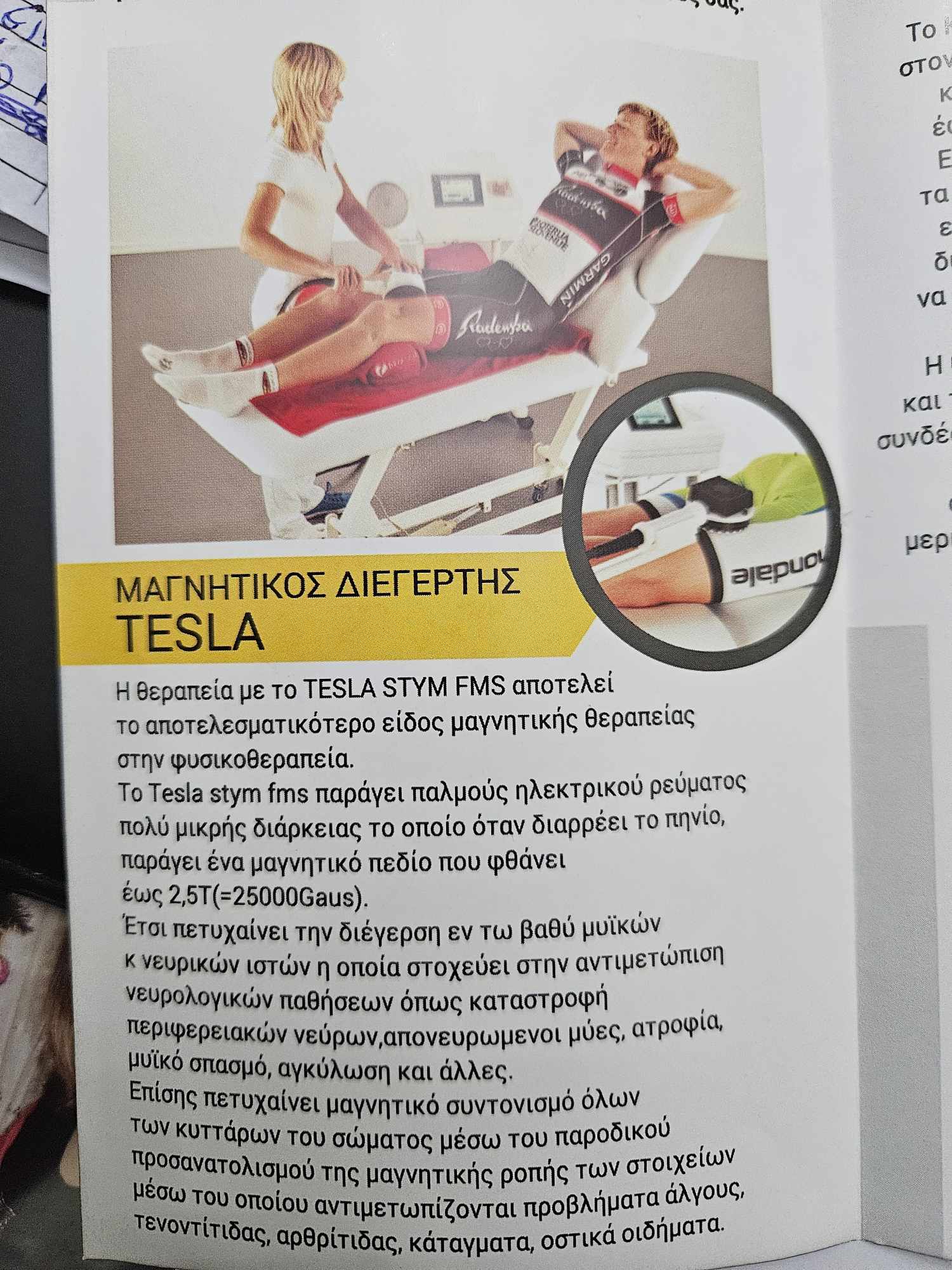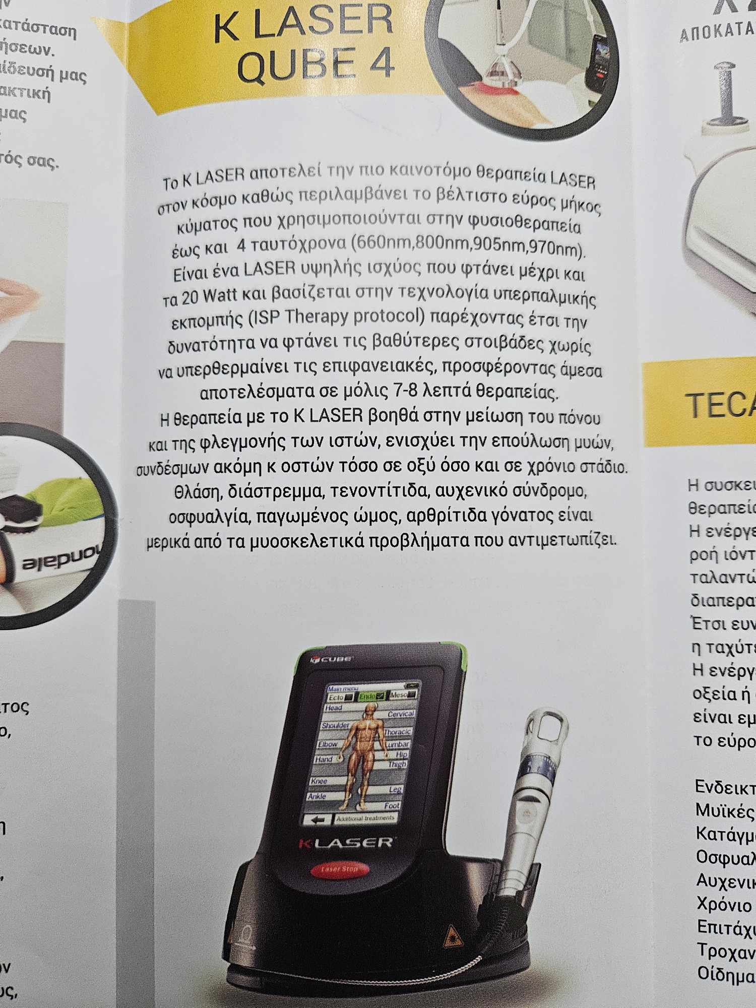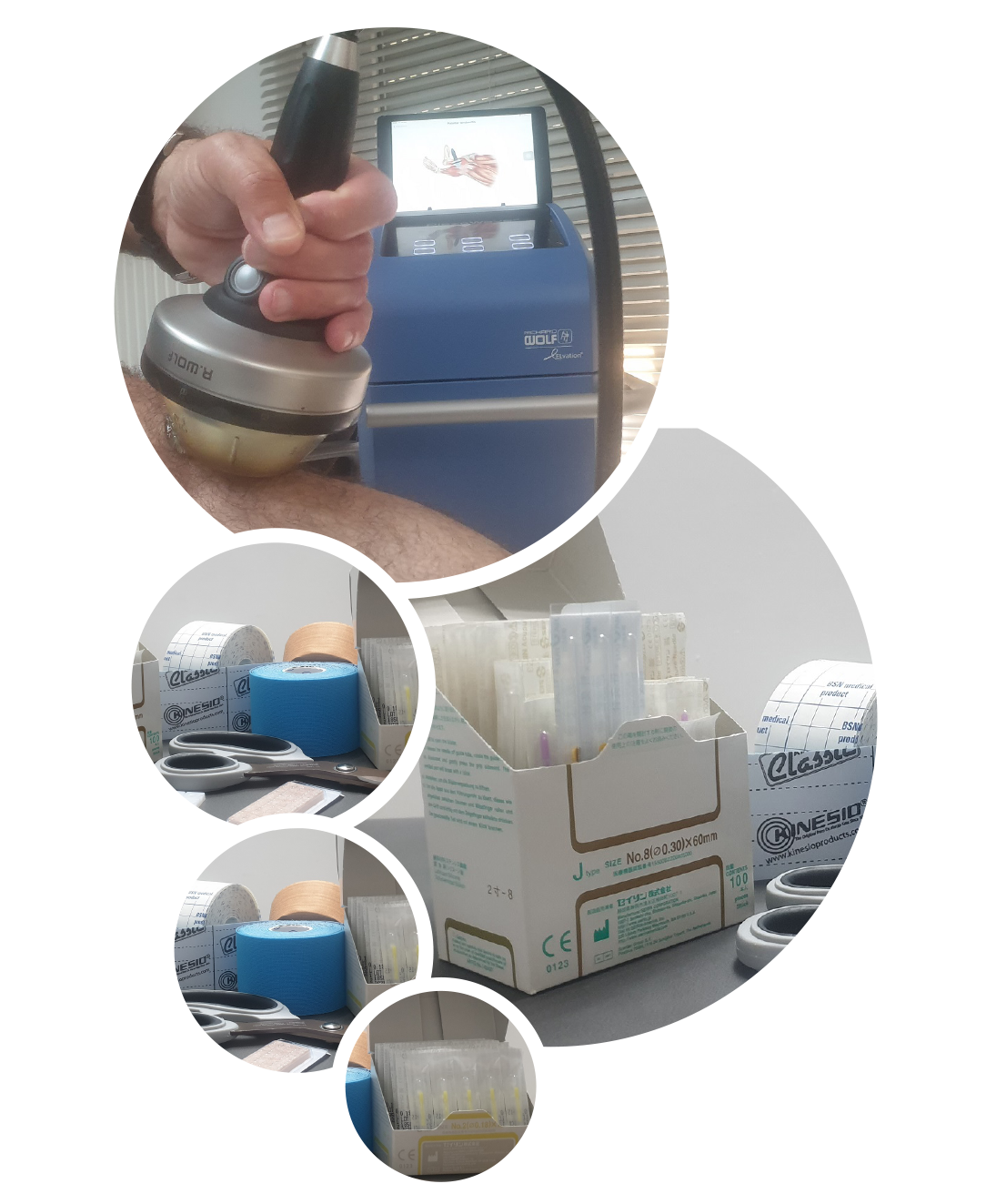 Τέλος, το εργαστήριό μας είναι πλήρως εξοπλισμένο με κορυφαία μηχανήματα φυσικοθεραπείας, όπως κρουστικά κύματα Piezowave 2, μαγνητικό διεγέρτη, Winbank Tecar, Laser Qube 4, πελματογράφο και όλα τα κλασικά μηχανήματα φυσικοθεραπείας, που θα μας βοηθήσουν στην πιο γρήγορη αποκατάσταση των ασθενών, ακόμη και σε προβλήματα που πριν από λίγο καιρό η θεραπεία τους ήταν μόνο χειρουργική, όπως, π.χ. η ασβεστοποιός τενοντίτιδα.